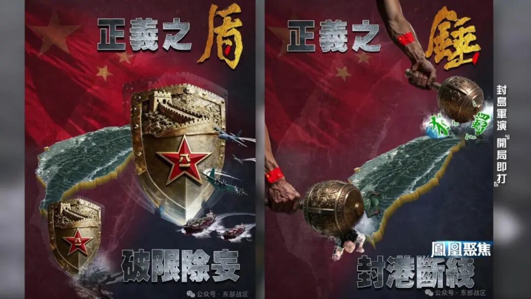 封控和拒止外部势力,成为本次演习的重要特点之一。解放军发布的两张演习海报也从侧面印证了这一点。海报上,两个盾牌分别安置在台岛北部和南部,正义之锤也是打住了一南一北。分析认为,这明显是为了挡住外来进攻。北边的盾牌就是针对日本,南边的盾牌放在巴士海峡的入口,很明显是要挡住美军。
